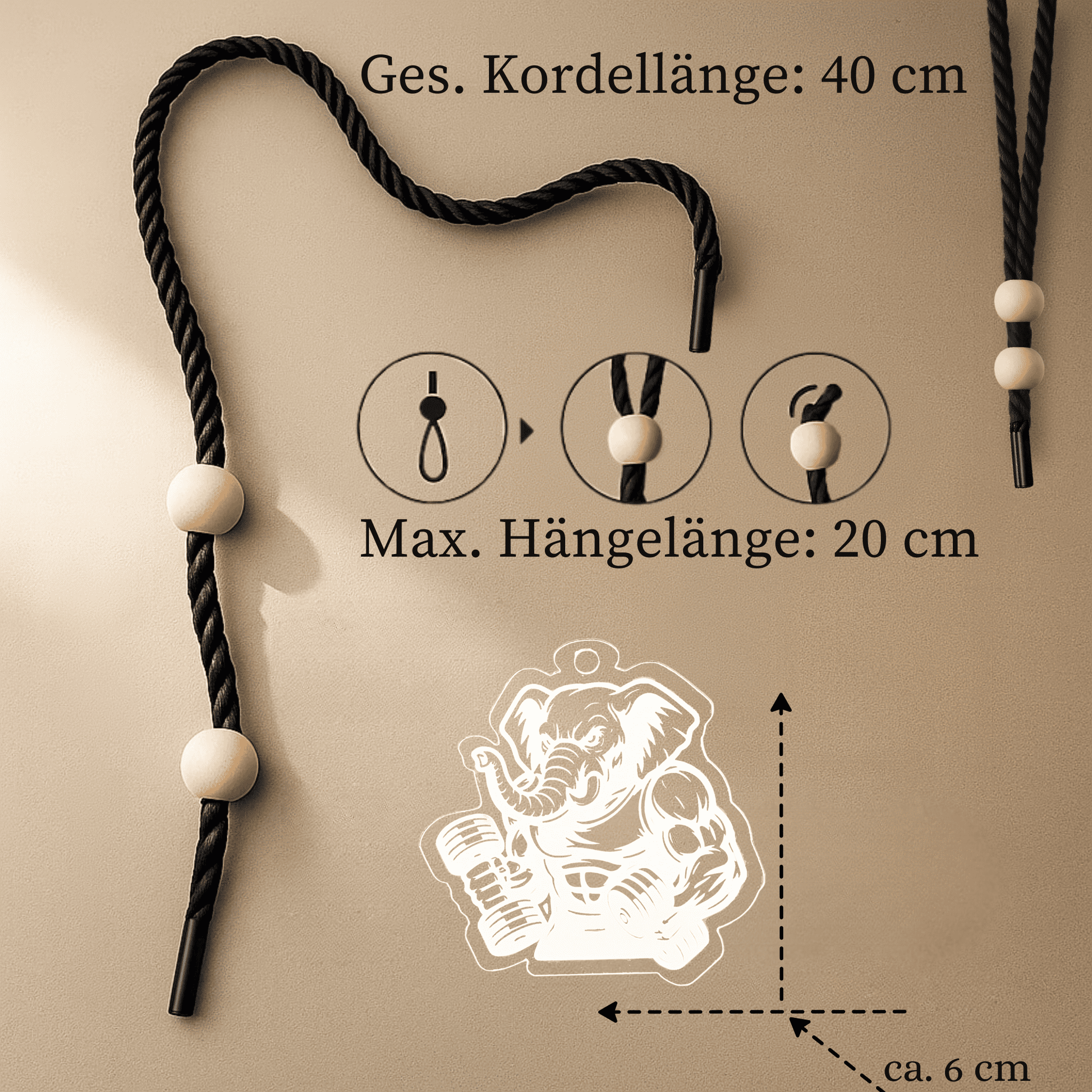 - Gesamtlänge der Kordel: 40 cm