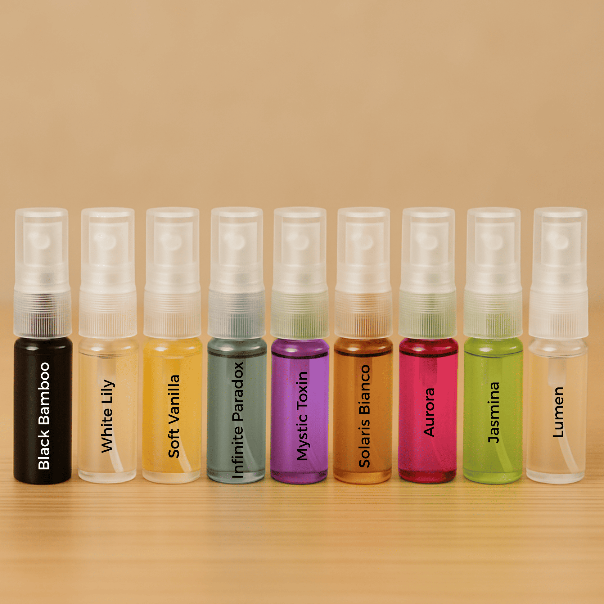 Die transparenten Mini-Flaschen mit weißem Sprühkopf dosieren zuverlässig feinen Duftnebel, ohne zu tropfen.